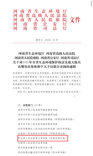 喜报—民权县法院综合审判庭(环境资源法庭)获..