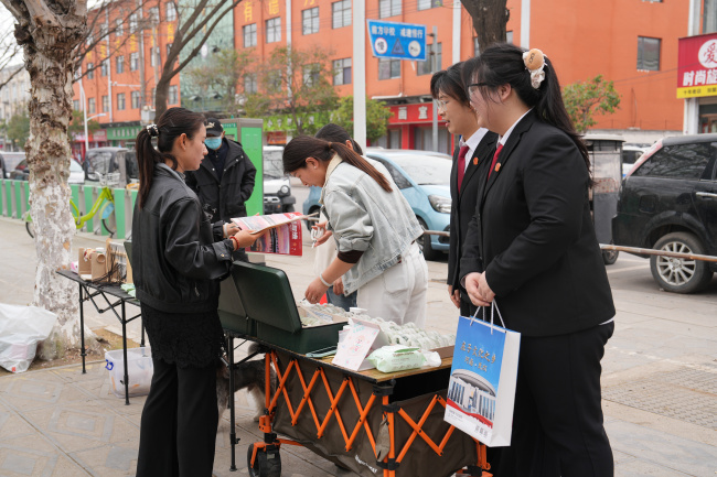 为优化法治化营商环境,切实提升人民群众与商户法治意识,4月2日下午,民权法院组织干警志愿者前往庄子广场及周边沿街商户,开展“法治是最好的营商环境”主题法治宣传活动。